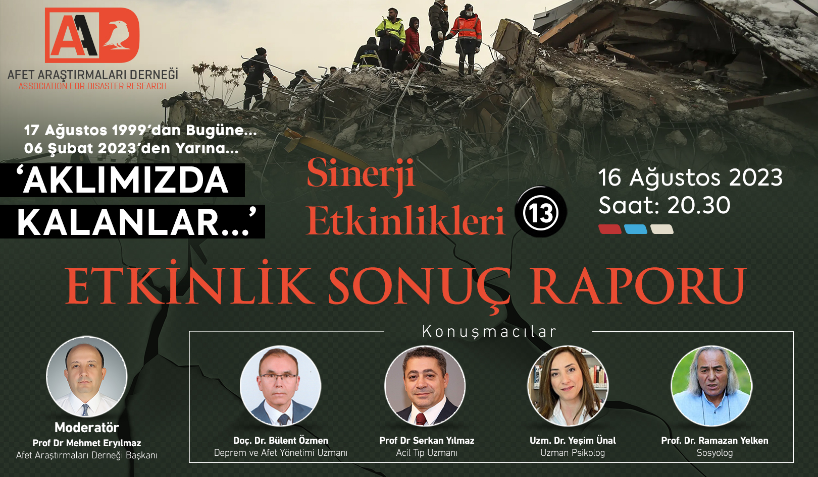 Afet Araştırmaları Derneği tarafından 17 Ağustos 1999 Büyük Marmara Depreminin 24. yılı anısına düzenlenen 13. Sinerji Etkinliği'nin Sonuç Raporu yayınlandı.