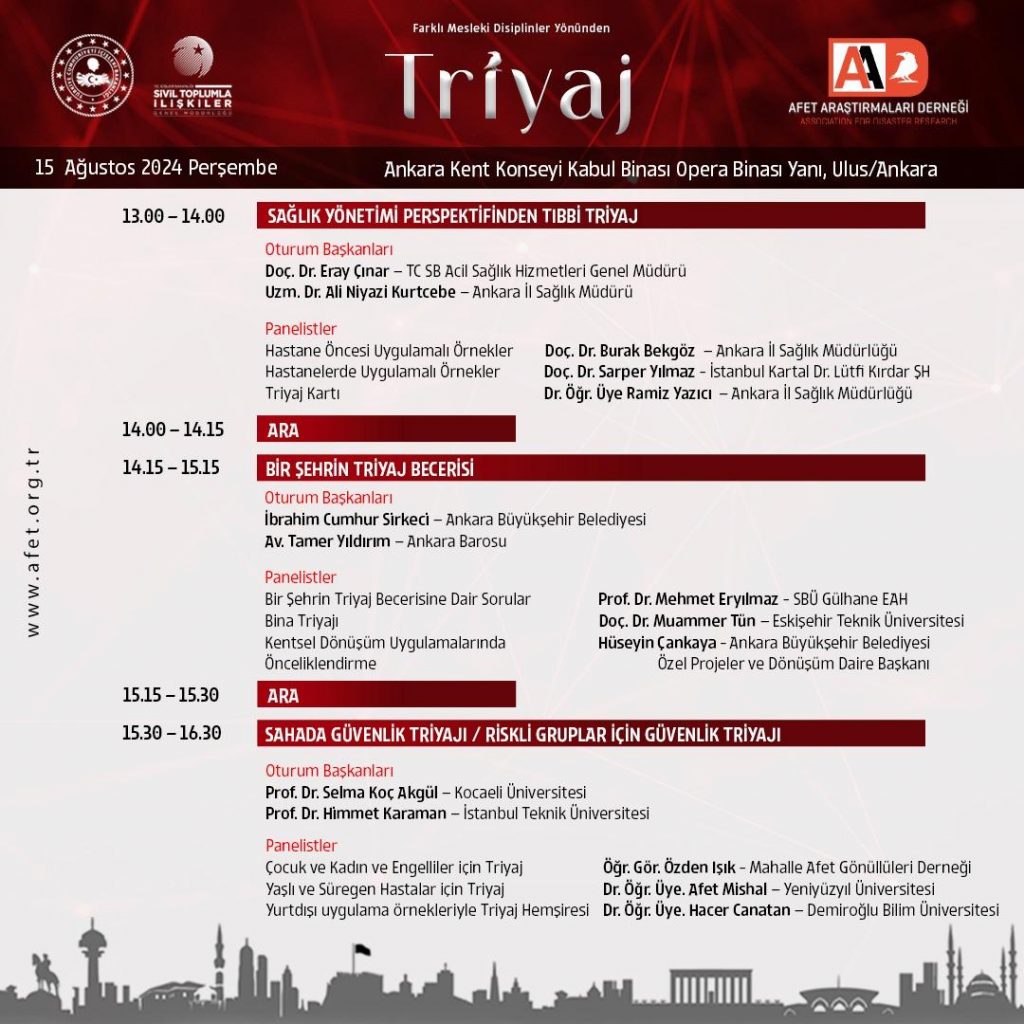 Farklı mesleki disiplinler yönünden Triyaj Ağustos 4, 2024 yazar Afet Araştırmaları 15-16 Ağustos tarihlerinde Ankara Kent Konseyi binasından gerçekleştirilecek olan etkinlikte, “Farklı mesleki disiplinler yönünden Triyaj” ele alınacaktır. Programın detayları aşağıdaki gibidir.